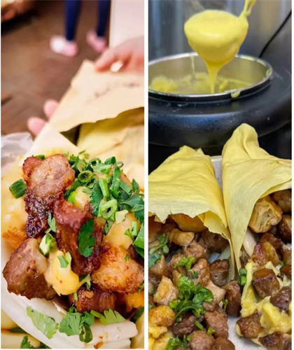 鳳慶粑粑卷是鳳慶縣的一大特色美食,是鳳慶廚師應(yīng)市的佳作,是集云南民間吃豌豆、稻米的食風(fēng),分制合成而食的又一名點。粑粑卷的主要配料有大米粑粑、鍋巴、稀豆粉和各種調(diào)料,鍋巴和稀豆粉是“靈魂”,并且都是由豌豆粉做成。將豌豆粉加水稀釋,隨后加鹽、辣椒面等進行調(diào)味,用勺子在燒熱的鐵鍋中均勻涂抹調(diào)好的豌豆粉,幾十秒內(nèi),一張香脆可口的粑粑卷外皮就做好了。此時,將大米粑粑烤熟,加入蒜末油等調(diào)味料,一卷美味的粑粑卷就做好了。輕咬一口,口感軟糯脆香。粑粑卷是當(dāng)?shù)厝俗钕矏鄣囊环N特色小吃,也蘊含著當(dāng)?shù)厝说娘嬍沉?xí)慣。生活在他鄉(xiāng)的游子們,一回到鳳慶,常常要先吃幾個粑粑卷解解饞。
