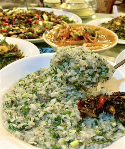 佤族雞肉爛飯,佤語叫noig ia“饃牙”,是佤族飲食文化的代表之一,滄源佤王宴的主食之一,也是佤族迎賓待客的美味佳肴,2022年,佤族雞肉爛飯制作技藝被列入云南省第五批省級非物質(zhì)文化遺產(chǎn)代表性項目名錄。把清洗好的米倒進雞湯煮至大米熟爛、稀稠,插筷而不倒。把晾涼的雞肉用手撕成絲與骨頭分開,將撕細的雞肉倒入鍋中同稀飯攪拌均勻,蓋上鍋蓋燜煮三分鐘左右。出鍋時加上切碎的阿佤芫荽、野生香蓼、青小米辣、嫩茴香葉、小蔥等佐料,美味的雞肉爛飯就烹制完成。雞肉爛飯口感細膩絲滑,伴隨著阿佤芫荽特有的香味,仿佛置身于臨滄的山林之中。