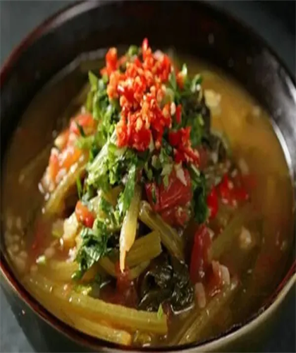 酸扒菜是云南鎮(zhèn)康地地道道的風(fēng)味菜,從縣城到農(nóng)村,鎮(zhèn)康人都有做酸扒菜的歷史,酸扒菜是鎮(zhèn)康人的拿手菜,是鎮(zhèn)康人的招牌菜之一。做一道酸扒菜并不難,但吃起來要酸香味俱全就很不容易。酸扒菜有個特點,不同的人用同樣的食材做出的酸扒菜味道也有差別。衡量酸扒菜做得如何,關(guān)鍵是吃起來是否酸到胃、辣到胃、香到胃。在鎮(zhèn)康,有這樣一個故事,講的是一位遠方的客人來到鎮(zhèn)康,好客的主人用鮮魚招待這位客人。當(dāng)主人拿酸筍子準(zhǔn)備放入鮮魚湯里,客人看見了說,哎呀!別放了,這東西與鮮魚放在一起一定不好吃,會破壞魚肉的味道。主人說,你以前沒吃過怎么就知道一定不好吃呢?放上嘗一嘗好嗎?吃飯了,客人嘗了嘗,覺得味道很好,并贊不絕口,魚肉也顧不上吃了。酸扒菜有兩個重點,也就是在“酸”和“扒”兩個字里。煮酸扒菜一定要放酸的配料,除了酸筍還可以選擇酸木瓜、西紅柿、大樹番茄等。“扒”字意思是食物經(jīng)過烹煮后,已經(jīng)熟了,入口酥爛能吃了的意思,所以酸扒菜的“扒”字就代表著需要長時間地煮才能達到。只有經(jīng)過長時間的小火慢燉,食材味道才能充分實現(xiàn)美美與共的統(tǒng)一。